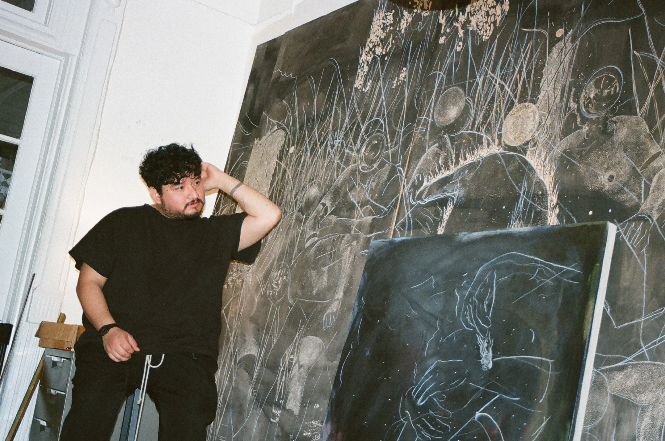 His current work explores themes of polarity, time, memory, and contrast – often rendered in charcoal on raw canvas.
